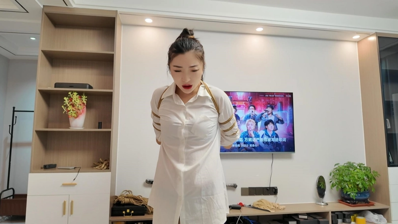 佳佳只穿一件白衬衣,一套黑色内衣,被五花大绑,超大口球堵嘴,摘下的时候干呕不止,带到卫生间,用可乐喷身,强行灌可乐,上演了一部湿身大片