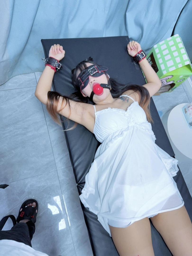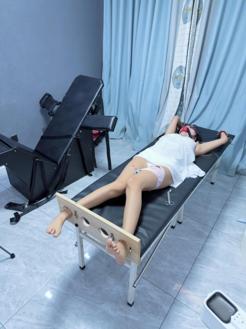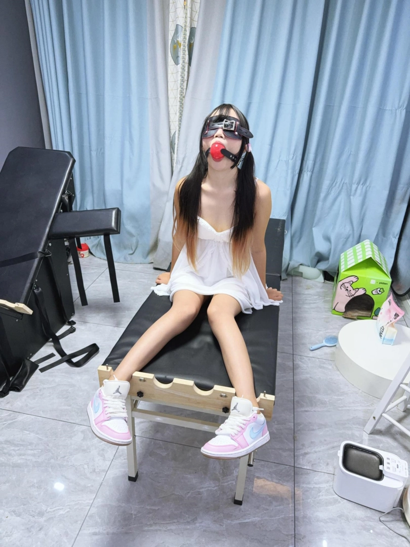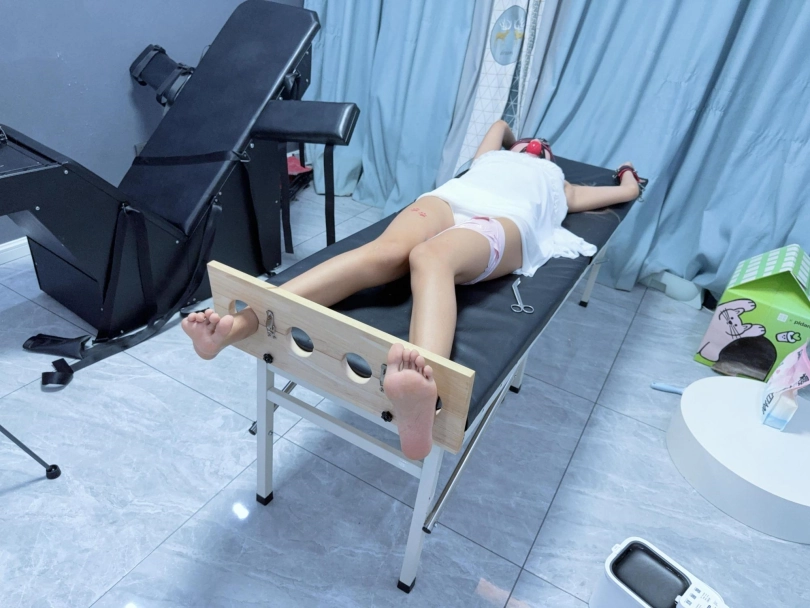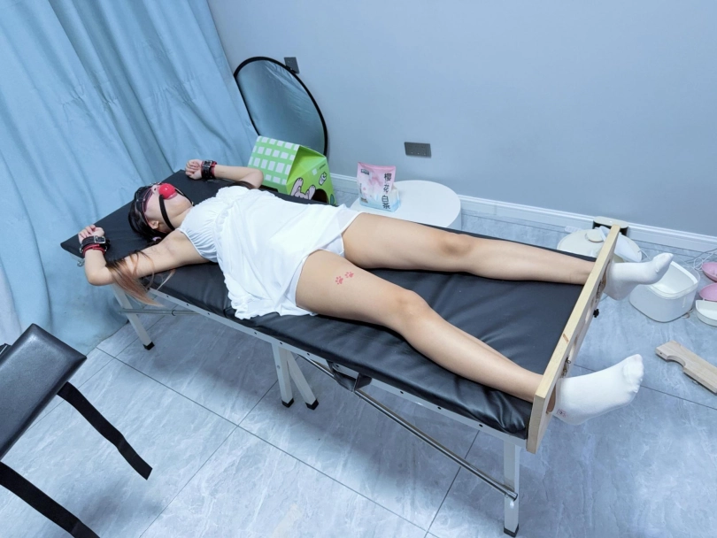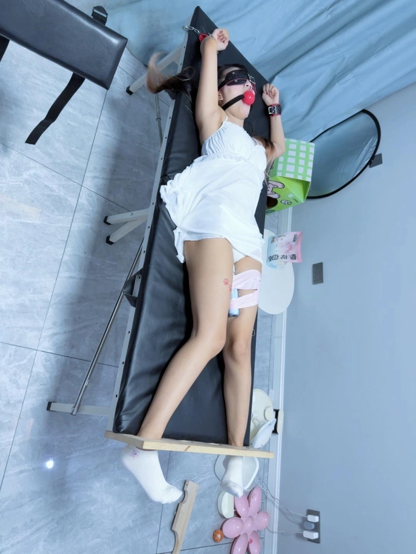 足枷+手铐大字固定在刑床上,戴上眼罩和5.5cm超大橡胶红色口球!脱掉运动鞋露出小白袜,然后电击极乐猛烈攻击!先用手拿着怼,怼累了我休息糖糖不能休息!用胶带固定在大腿根放置~可爱的妹妹在刑床上扭来扭去,身体都在不停颤抖,无法控制~