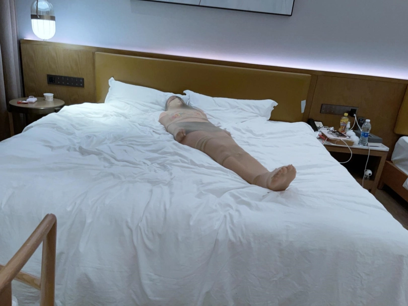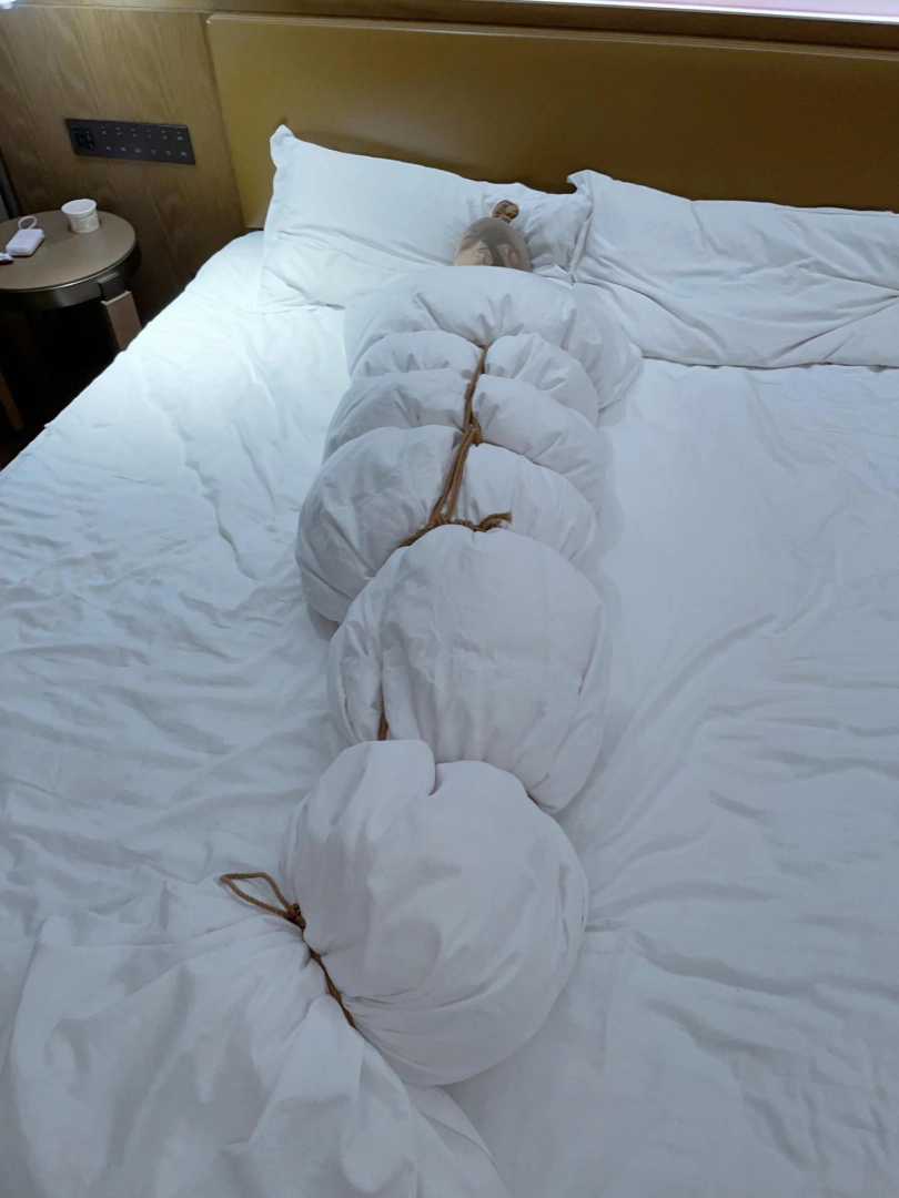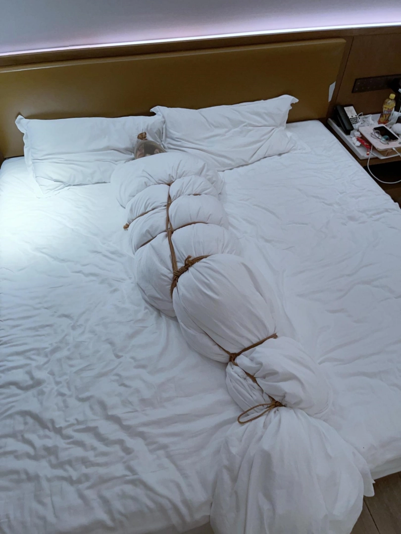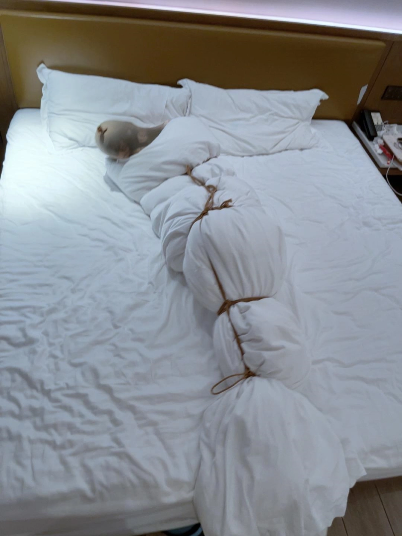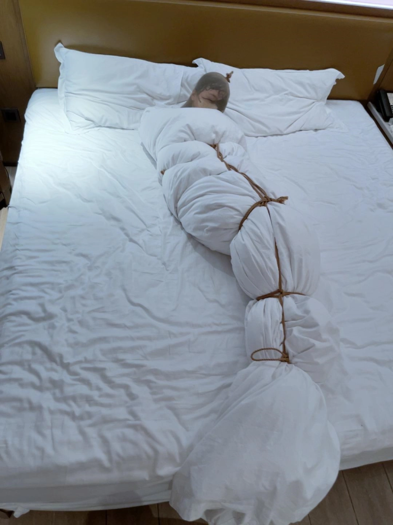 然后开始兴奋——妹子开始在里面夹腿自嗨,并且艰难地用手指尝试触碰下面..(这段第一人称采访妹子不让写,总之挣扎蠕动,舒服的扭来扭去)“总之被包裹起来太无聊了,夹腿成了我在里面唯一的娱乐方式,提醒我还作为人清醒着”