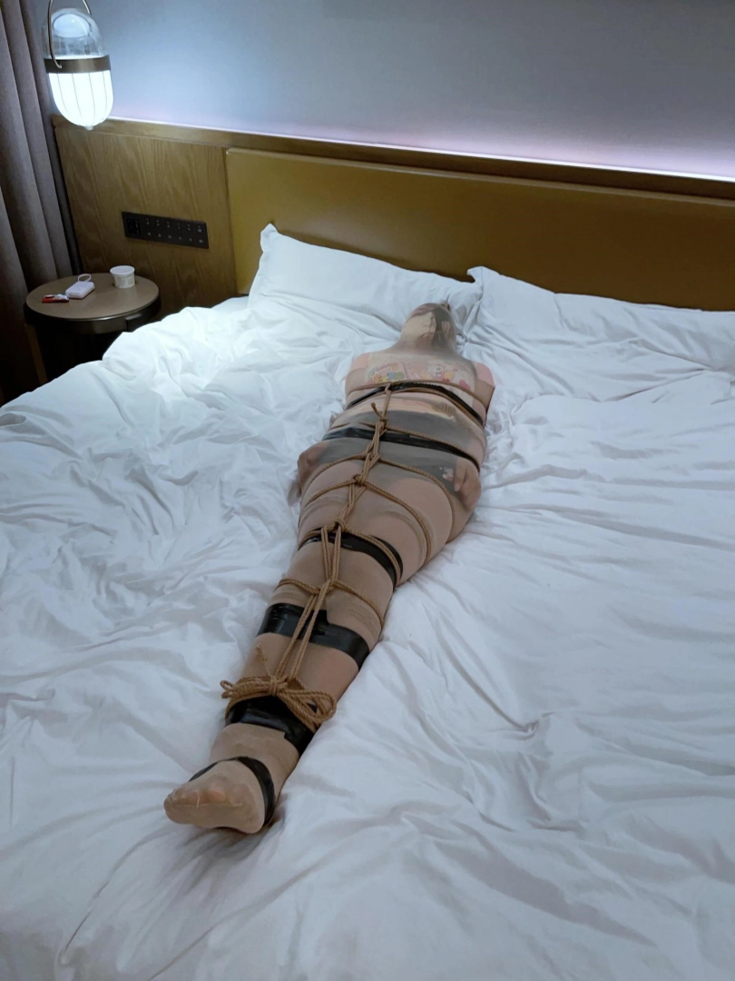 第二层拘束——丝袜全包:用全包丝袜从脚套到头,把被绳子拘束成人棍的糖糖包成丝袜木乃伊~
