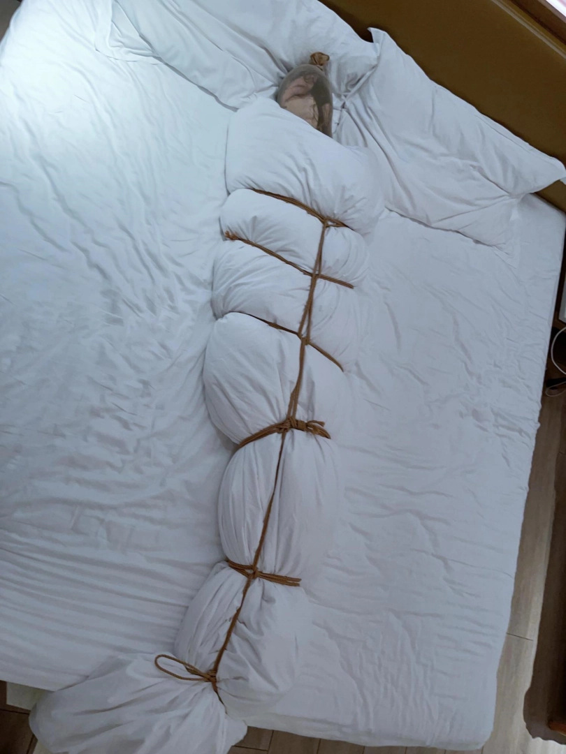 第四层拘束——棉被:把棉被铺开,让妹子躺在上面,然后用棉被卷好裹紧,只露出被丝袜包裹的头部。