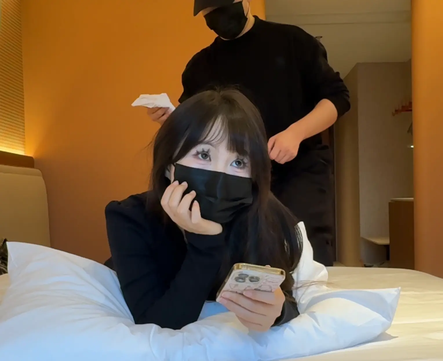 小美回酒店没注意到身后已经跟了一个变态,回到酒店里,小美背对着门在床上正在舒服的享受着时光,却浑然不知后面的变态通过掩虚的门悄然进入,