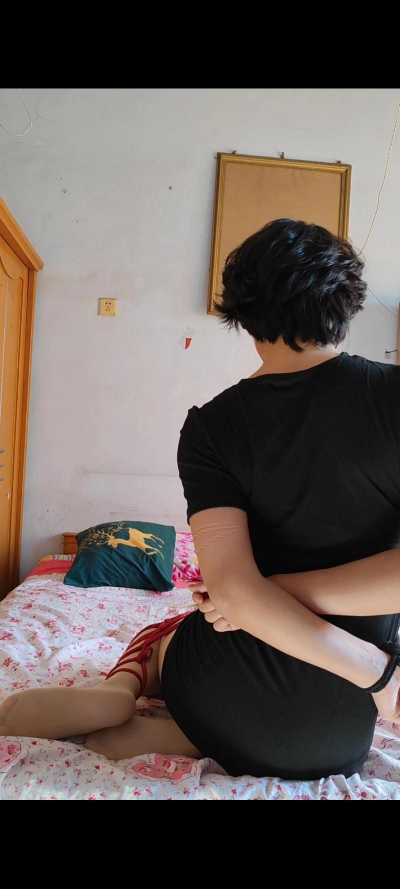 而且将收紧两臂的穿插绳子也给吊在身后,对大臂的束缚起到了绝对的固定作用,有绳子的阻碍,自己没法将大臂处的绳子想下扯到小臂,只能始终如一地保持大臂被紧紧捆绑在身后的形态直到手腕解开。