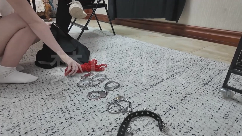 何晓雯则是不慌不忙的从身旁的手提袋中取出了一些道具,有手铐,脚镣,拇指铐,项圈和一捆红色的麻绳。