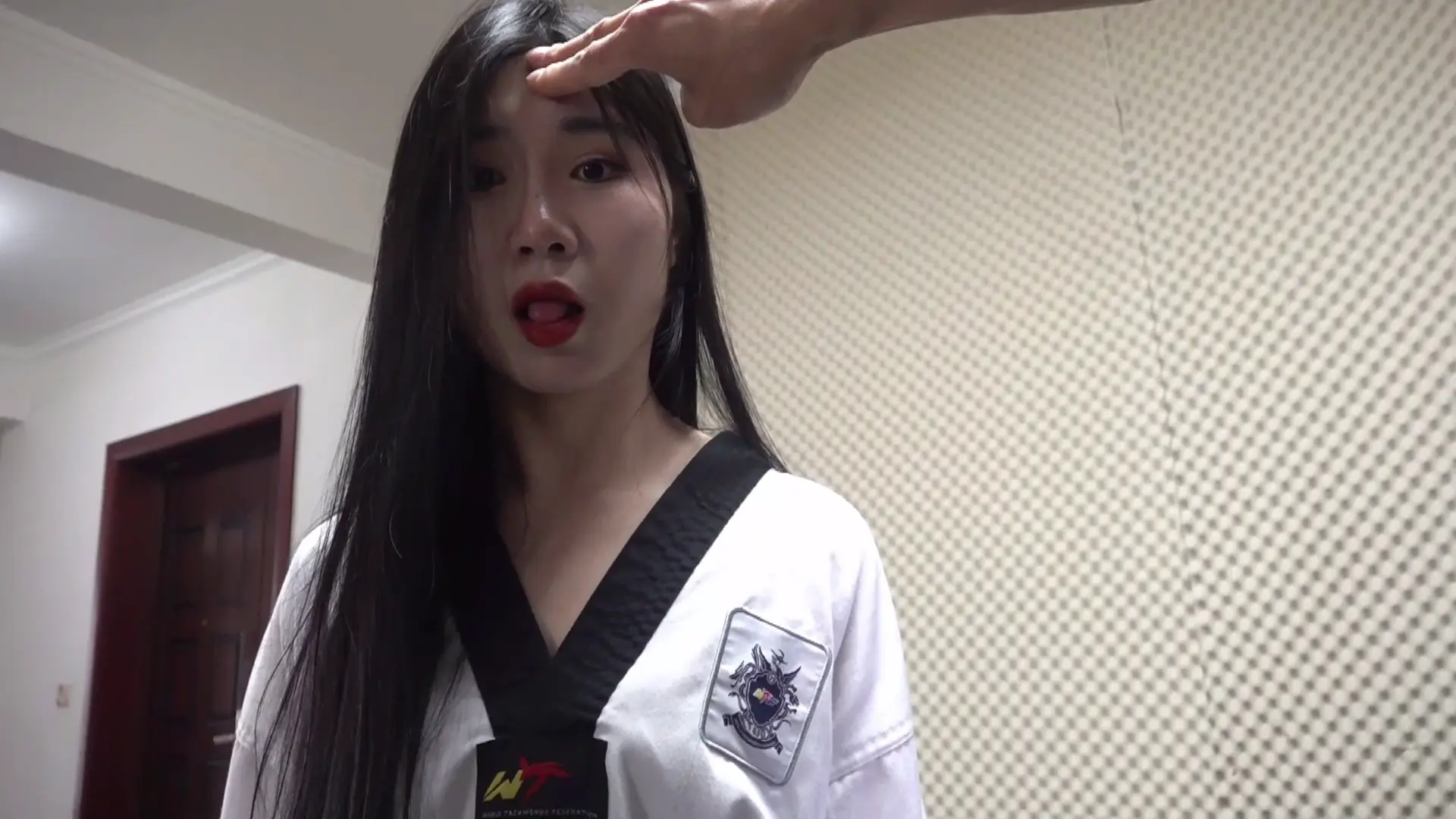 女主在房间内翻找,拿起一本书,说:“有种功法可以把尸体变成雕塑一样矗立不倒,前两位掌门死后就是这个样子,这么看来是他做的无疑了,我赶紧去报告。”这时男主偷偷来到女主身后点了女主的穴道(音效),女主 “哪个狗贼,快解开我的穴道!”,男主:“你在我的房间,却骂我狗贼”。女主心想:“我得赶紧喊出暗号让伙伴们过来。”喊:“乌拉巴哈,乌拉巴哈,乌拉巴哈”男主点了女主哑穴,女主保持张开嘴的姿势【嘴巴张大一点】男主:“行了别喊了,你的同伙都被我杀了,可惜没问出来谁派来的,只能由你告诉我了”女主一脸愤怒,男主解开女主的哑穴,女主:“你这个恶魔,我什么都不会说的,你干脆也杀了我吧。”男主:“这可由不得你。”男主点了女主的笑穴,正当女主想笑出声的时候男主立刻点了女主的哑穴,女主的笑声戛然而止,露出笑意,可惜笑不出声来,很难受,过了一会,男子解开女主的哑穴,女主立即大笑,边笑边骂【自由发挥,笑穴给正面镜头】男子开始动手动脚,女主丝毫无法反抗,男子就这样欣赏着美人的笑声,男主扶女主坐到地上,腿伸直,脚底直冲镜头,玩弄女主的脚来(脚底冲着镜头),挠脚心调戏着女主,边调戏边说:“怎么样呀,现在肯说了吗?”女主偷偷冲开了穴道(给一个用力的表情)抬脚踢走了男主。正当女主想踢出第二脚时,脚被男主抓住,男主挠了挠脚心,女主失去反抗能力,男主趁机又点中了女主的穴道,女主保持腿向上抬不能动。男主把女主腿放下,回到之前腿向前伸,脚底冲着镜头的姿势。男主:“你们修炼的功法都有一个弱点,就在脚底。”然后男主挠女主脚心(音效),同时逼问女主身份。女主一边笑一边骂男主,让他放开自己,几分钟后男主见女主不肯说,于是说:“我知道脚底有个穴道,点中以后比挠脚心还要痒十倍。”男主点中女主脚底穴道,女主又开始笑起来,男主:“不想难受就快招了吧。”女主一边笑一边定着,特写脚底和脸,一会儿后女主笑晕了过去(之前是坐着,这时候躺倒)