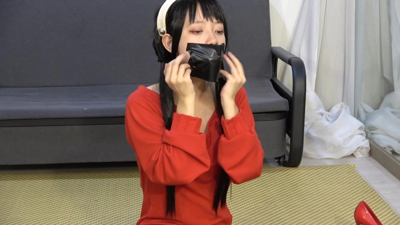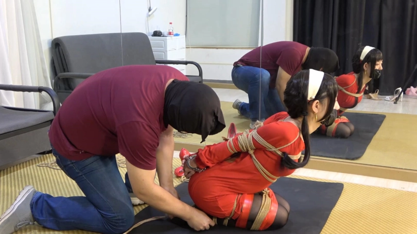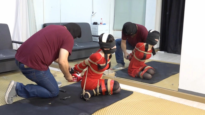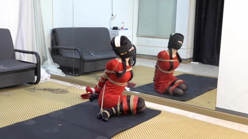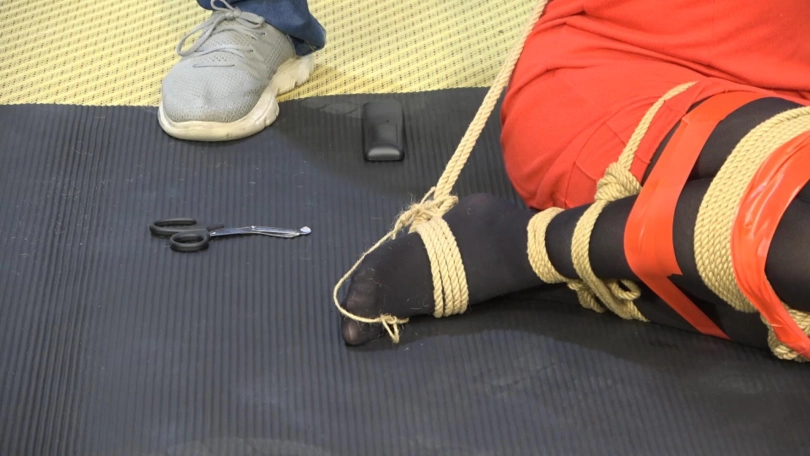 约尔脱下鞋子,整齐放在脚边,用胶带绑住双脚和双腿。跪下,拿起胶带与堵嘴物,封住自己的嘴,用手铐反铐住自己。特务这下大胆起来,开始用绳子捆绑约尔。他用绳子将约尔双臂并肘绑住,和身子绑在一起;大小腿绑在一起,跪在地上再用胶带缠绕加固捆绑,双脚脚面被绑住,绳子与手腕处的绳结连接,大脚趾也被绳子绑住