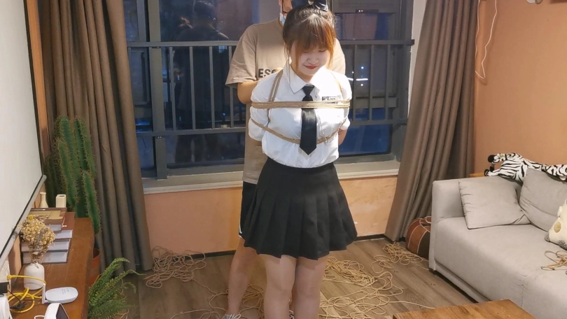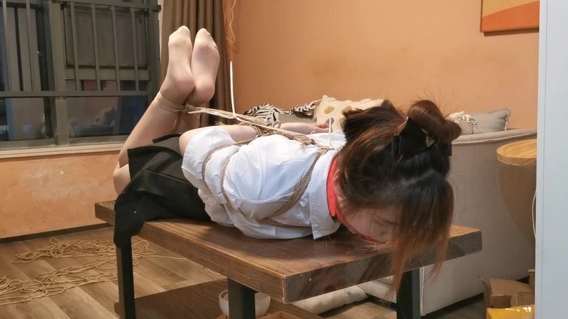 经典的JK制服,驷马放置在茶几上,并且这次用扎带拴住了口球向后拉让玥妍没办法把口球往外顶,最后茶几上的口水都流满了顺着边流下去了。
