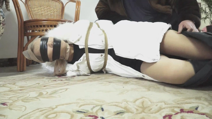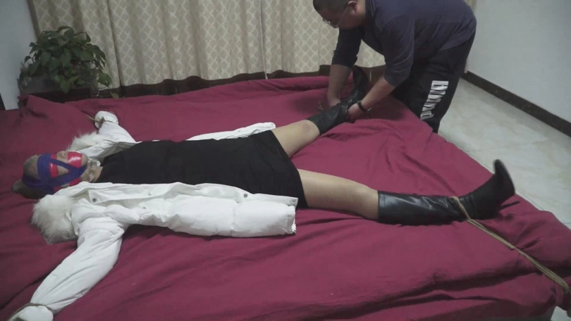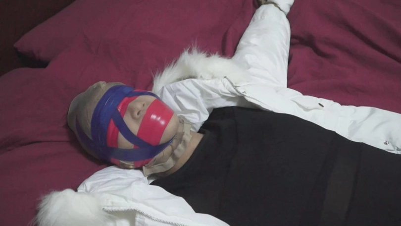 然后屌丝男说困了要去睡觉,就解开了女主束缚。脸上用更严密的方式蒙眼堵嘴,再大字型绑床上。