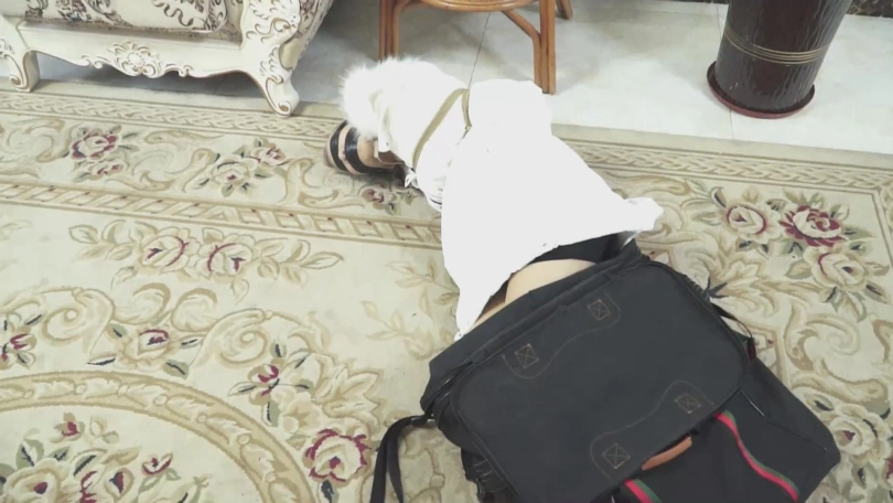 等美女醒来,已经被屌丝男绑架了,用袋子拎进了门。