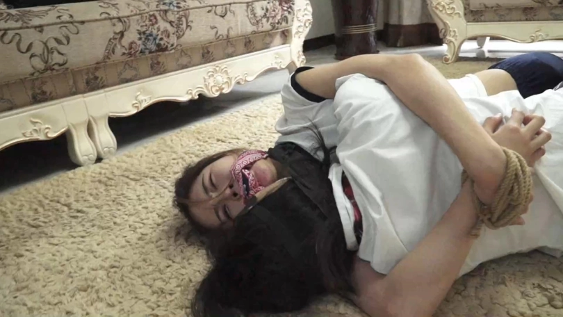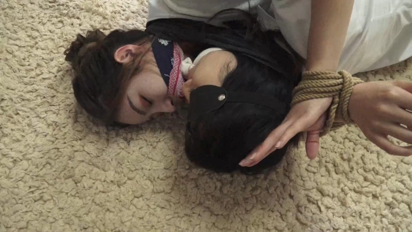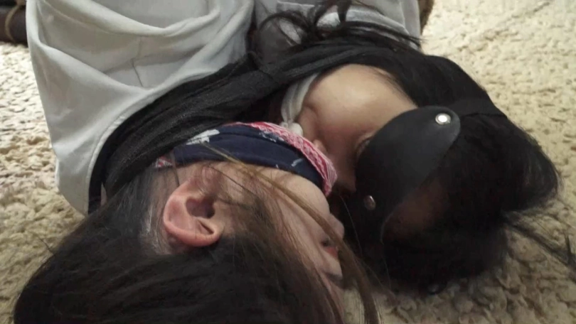 镜头一转,两人背靠背坐在地毯上,腿部捆绑和蒙眼堵嘴都不变。两人的双手交叉绑在对方身前如右图,大拇指都被扎带扎住,不能动弹。