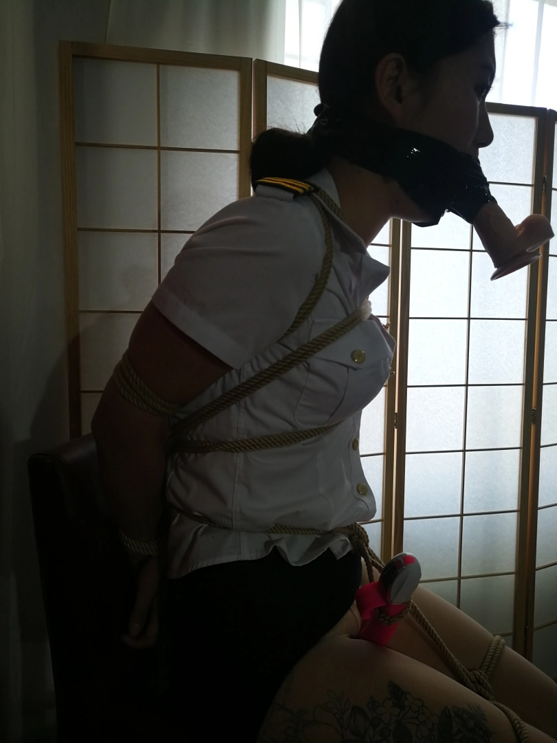 女主没来及说话,就被捂住嘴巴,塞了假阳具口塞,特写慢慢塞入假阳具口塞的镜头,还是按照刚才的捆法捆起来,不过多了一个驷马。女主不停挣扎,男主解开上衣扣子露出胸罩,然后又慢慢撩起女主的超短裙露出丝袜和内裤,拿出震动棒,在女主的脸上不停逗她,又在女主的胸部用震动棒挑逗(意思意思即可,但女主表情要到位),然后又抚摸了几下女主的身体,让女主自己挣扎。挣扎过程中特写口球和丝袜。