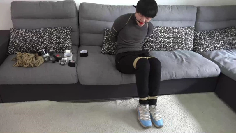 现在阿兰也跟男友一样被结结实实捆绑起来,嘴巴带着口球坐在沙发上二人一起挣扎。