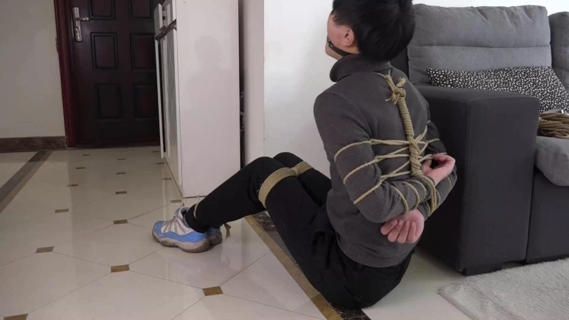 阿兰男友想起自己家里来了劫匪,随即开始扭动身体挣扎,可无济于事,他只好想办法坐到地上,试图往大门处移动。