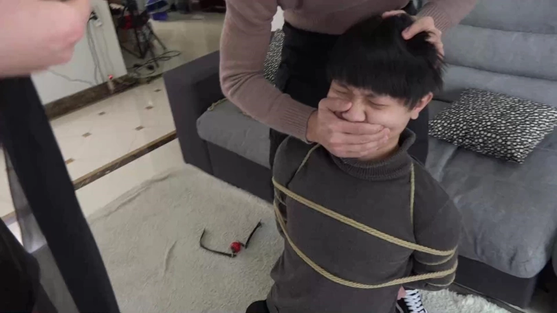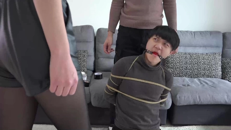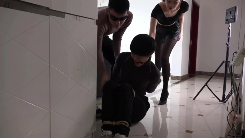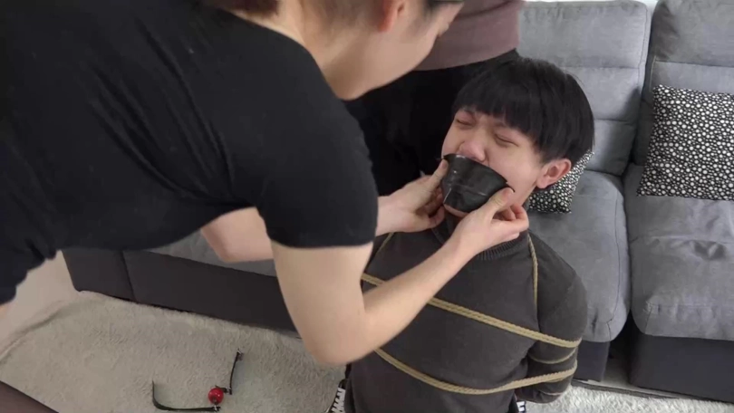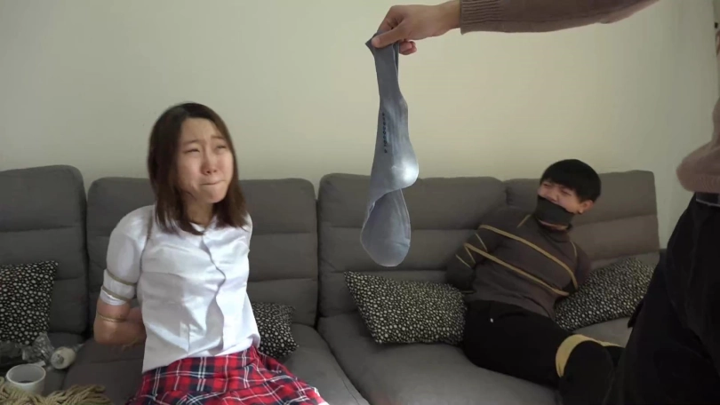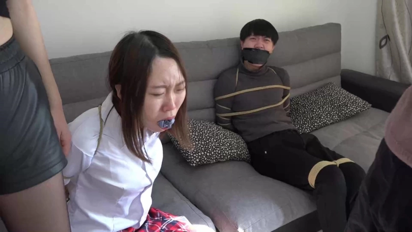阿兰与男友拼命挣扎着,可严厉的捆绑与塞嘴限制了他们的活动空间,最终二人减小挣扎幅度,低下头喘息着。