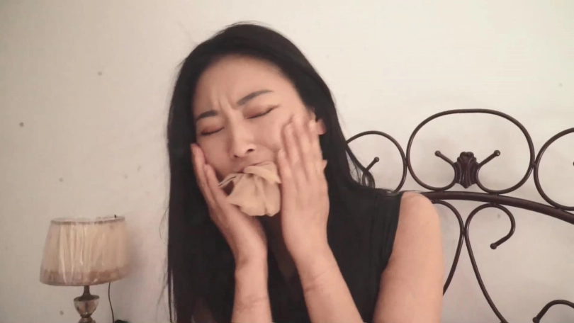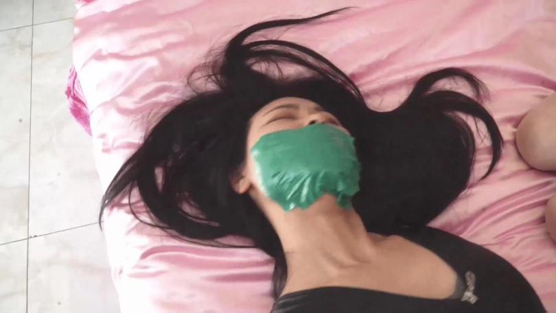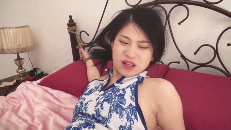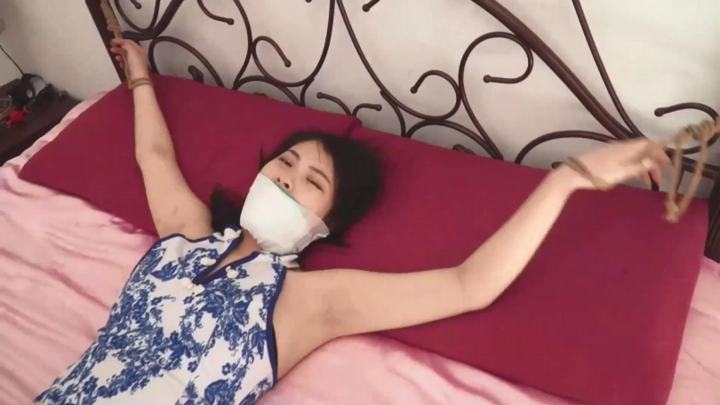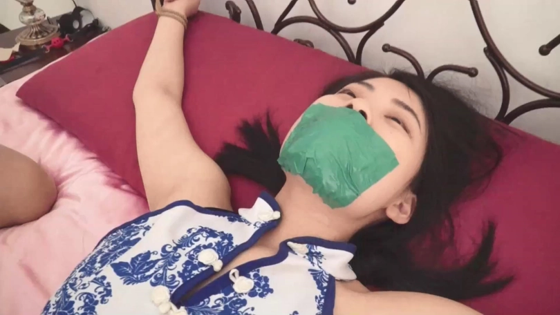 旗袍肉丝美女李诺从昏迷中醒来,发现自己被绑,表情惊恐,呜呜挣扎着。