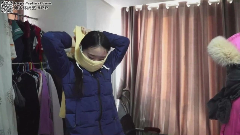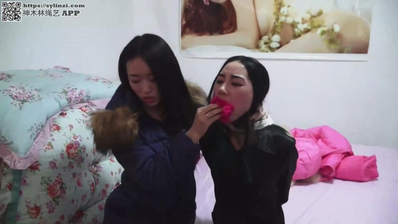 那人把冬岚的红色羽绒服脱下,见她里面穿着毛衣,就把冬岚的双手扭到背后,又用绳子捆了起来,然后用绳把手固定在身体上。冬岚郁闷,手还没有完全放松,怎么又被捆上 了?   那人松开把冬岚的脚捆在椅子上的绳子后,又把冬岚的脚牢牢地绑在一起,然后把她横抱起来放到床上。就这样,冬岚被捆绑着手脚,堵着嘴,昏昏的睡去了。   第二天冬岚被摇醒,松开脚抬到厕所排泄后又被放到床上捆好,然后封嘴胶布被撕下,水泠泠的棉花团被掏出,接着喂了早饭和水。完后,那人又向冬岚嘴里塞进了一大团红色 的丝巾,冬岚的嘴里没有了任何空余的空间,那人又用布条将冬岚的嘴紧紧的勒住,防止她吐出堵嘴的丝巾。   那人很不情愿的说:“我要出去了,你在这儿老实的呆着,等我回来就和你好好玩耍。”说着用黑布蒙上了冬岚的双眼,冬岚又陷入了无尽的黑暗之中。那人似乎取下伪装后就 出去了。   听了他的话,冬岚完全明白他要干什么了。她在床上扭动着身躯,想把绳子挣开,离开这个危险的地方。但是绳子太紧,根本无济于事。她又想把嘴里的丝巾吐出来,但是丝巾 被勒嘴的布条牢牢地固定着,没用。   冬岚把脸与床摩擦,想把蒙眼的黑布蹭掉,黑布蒙得很紧,冬岚累得半死,也没有半点成功的迹象。冬岚绝望的大叫,但是声音都被嘴里塞得满满的丝巾吸收了,而且还被勒嘴 的布条挡住了,发出的只是微弱的“唔唔”声…………   挣扎了一会,冬岚听到了撬门的声音,然后是高跟鞋的声音。然后,她闻到了一股熟悉的幽香。   蒙眼布被摘掉了,在冬岚眼前出现的是一个长发美女,亭亭玉立,而且冬岚还认识她。她叫火美,是冬岚的同事。她“唔唔”的叫着,想让火美解开她。   火美伸手拔出她嘴里的布团,冬岚说:“火美,快解开我呀!”   “要是我不想解开你呢,因为我很喜欢捆绑美女。”火美阴阳怪气的说道。   “没想到你是这样的人,我哪点对不起你了!”冬岚骂道。   “我喜欢,怎么着!你知道吗,在你来之前我一直是逍遥仙境的头牌,男人都围着我转,我就像女皇一样。但是你来之后,他们都认为你比我更漂亮,更有气质,更迷人,于是 他们扔下我都去围着你转了,甚至本来是我男朋友的老板都把我甩了,成了你的男朋友,我都快气疯了!从此我就很想把那些美女们捆绑起来,特别是你,我的大美人,我特别想把 你结结实实的捆起来,然后严严实实的堵上嘴,蒙上眼,可没想到我能捡个现成的。”火美说。   “我根本没接受老板的追求,我只是敷衍他,我才不会为了钱接受老男人”冬岚怒道。   “靠!你长得太漂亮了,吸引了他,这就是过错!我早就想报复了,可是没有机会。我昨天无意间发现纪日行那个屌丝在你的房子周围鬼鬼祟祟的,就跟踪了他,没想到他把你 绑架了。”火美笑道。   “居然是他!”冬岚惊讶的大叫道。 “叫什么叫!”火美拿起一团布就塞进冬岚嘴里。冬岚绝望的叫着,但是眼睛被蒙上,被抱到了床上。 纪日行是她们会所的一位常客,每次去都点冬岚给她按摩。熟悉了以后,就开始追求她。纪日行的条件倒也不差,不然也去不起逍遥仙境,可不知为何冬岚就是不喜欢他。被追的烦 了,冬岚还指示保安把他打了出去,难怪他会来报复。   火美说:“纪日行快要回来了,我得带你转移去我家。这次太匆忙,没有准备车,得带着你在外边走了。   冬岚暗自高兴,心想:“一到外面,别人就能看见我被绑着,被堵嘴了,我也可以见机行事。”   火美说:“美女,你就走着瞧吧,现在可是寒冷的冬天。”说着,把冬岚拉起来,让她站着。   火美把冬岚的两条手臂已和身体连为了一体,怎么动也动不了了。接着,火美把冬岚那件又厚又大的羽绒服给她小心翼翼的穿上,把羽绒服拉好拉链、扣好后,把两只袖子放进 羽绒服那深深的口袋里。这样,外人看了,还以为是女孩正把双手插在羽绒衣的口袋里防寒呢。   下面的工作是堵嘴了。火美在原来的基础上用一根布条紧紧的勒住了冬岚那塞满棉布且棉布还露出一截的小嘴,那布条在脑后使劲的绑着。布条较窄,只从塞满布的嘴的中间勒 过,由于太紧,布条已略微凹进那露出的塞嘴棉布里,使布条上侧和下侧的未被布条遮住的露在嘴外的塞嘴白布略微凸了出来。   接着,一大块高性能胶布贴到了那既有塞嘴布,又有勒嘴布条的嘴上,使冬岚的嘴牢牢地密封起来。胶布很大,把鼻子以下的半个脸遮去了一半。然后,一条很宽的蓝色布带紧 紧的蒙在了那贴着高性能胶布的嘴上,布带在脑后用力的绑紧。布带很宽,把鼻子以下的脸全给蒙住了。   冬岚几乎窒息,只有靠小鼻子拼命的呼吸,她半点声音都发不出来了。   火美笑道:“美女小姐,现在你这个样子真是迷死人呀!但还要给你掩护掩护,不能让人发现你的嘴已失去自由。再委屈委屈吧!”说着,从口袋里拿出一只特大号的蓝色无纺 布口罩,又说:“这口罩透气性好,给你戴上吧,你不会憋死的。”说完,给冬岚戴上了口罩,口罩带在脑后紧紧的系住。   口罩很大,上端抵住了下眼皮,下端把整个下巴都包住了,口罩的两端都快接近了耳朵。这样,蒙嘴的蓝色布带被掩盖住了,但是脑后的布带还露出来。口罩戴得很严密,把鼻 子、被布蒙住的嘴和大部分的脸紧紧的蒙住。幸亏无纺布的透气性很好,不然冬岚就得憋死。   火美又用透明宽胶带把口罩带牢牢的固定在冬岚的脸上和头上。   然后,火美又取出一条很大的黑色纱巾。冬岚不